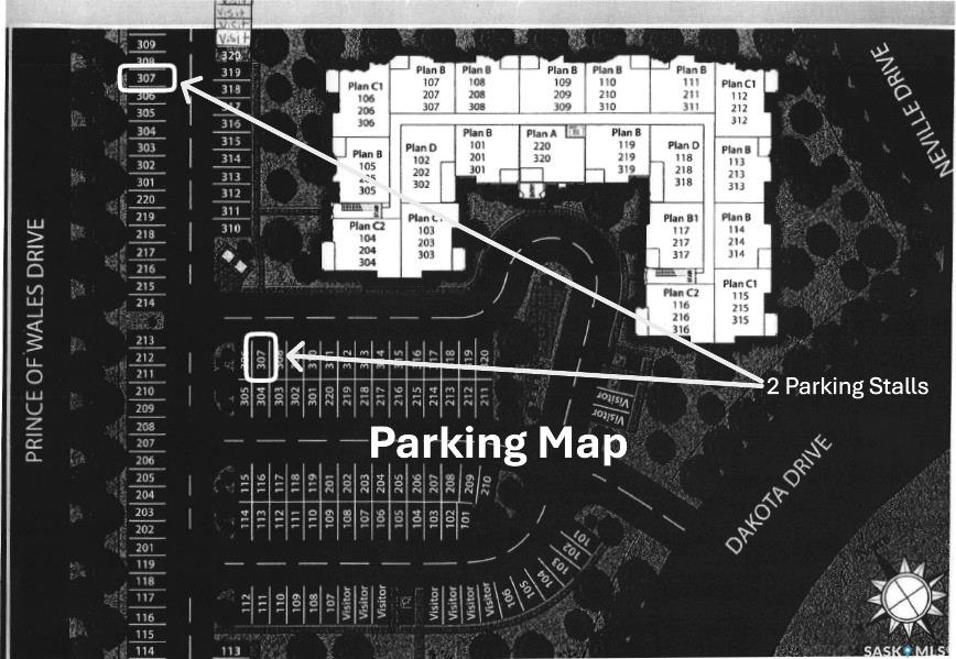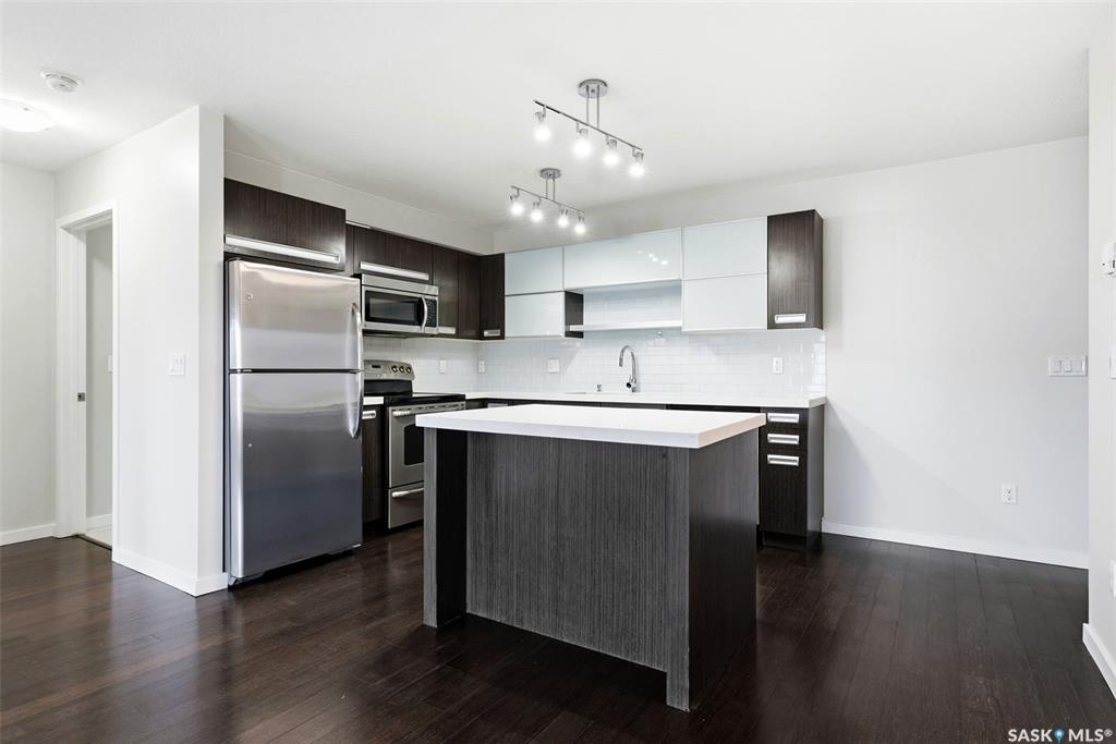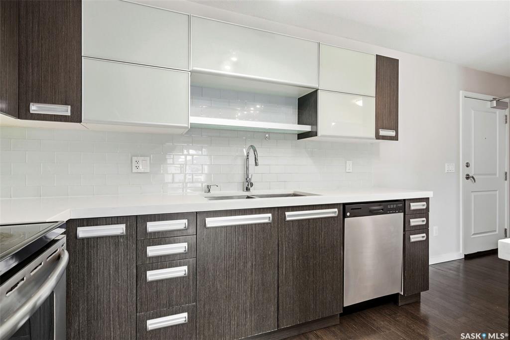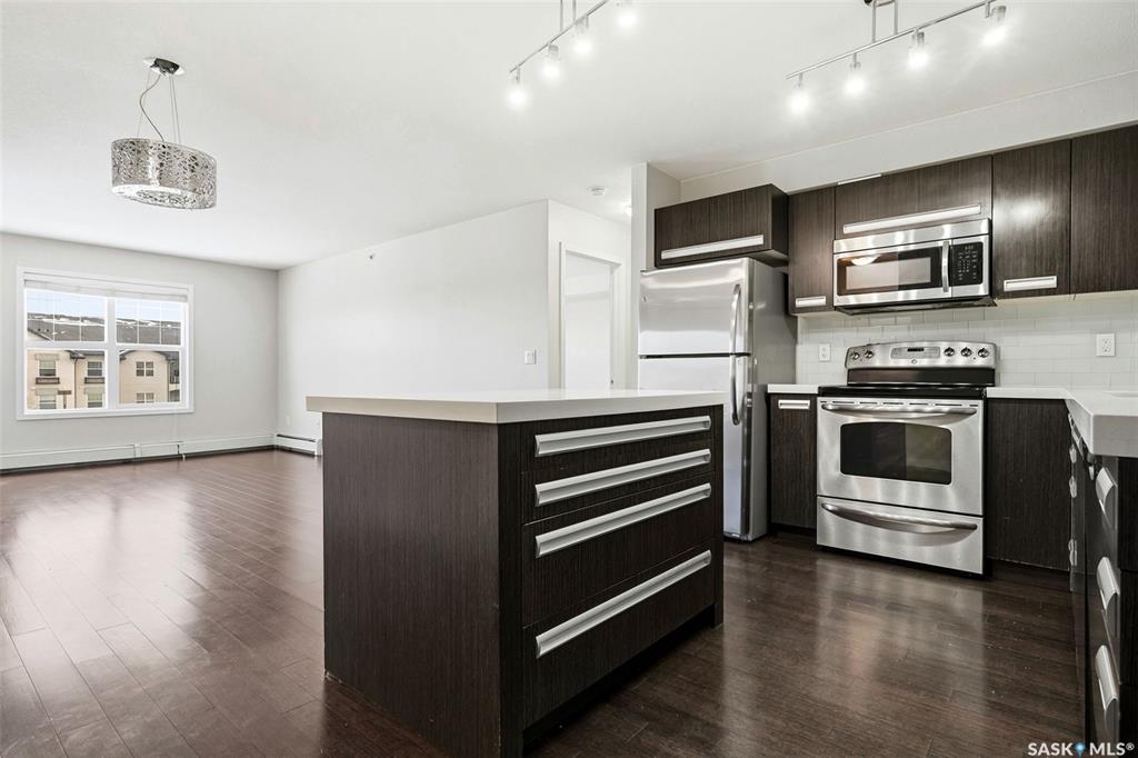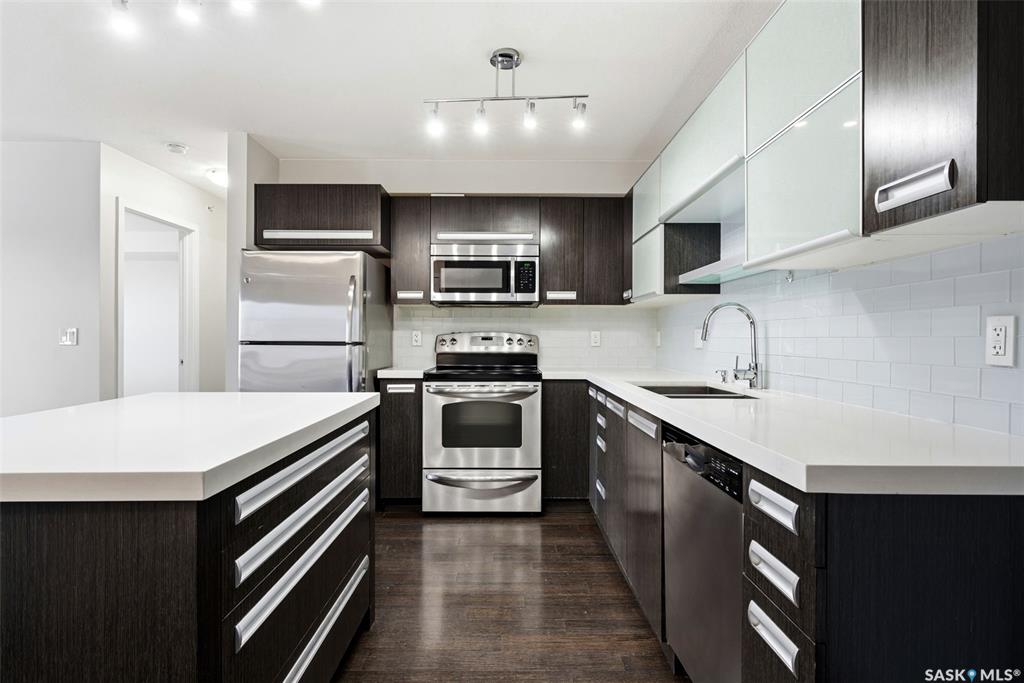 Move-in ready top floor 2 bedroom condo with 2 exclusive use parking stalls located in a desireable East Regina location. This upgraded top floor condo features quartz countertops in the kitchen & bathroom. Tile floors in the bathroom & laundry room. Engineered hardwood floors in the living room, dining area & kitchen. Carpet in both bedrooms. The primary bedroom and 2nd bedroom both offer walk-in closets. This condo includes a full set of stainless steel appliances in the kitchen (Over The Range Microwave,...