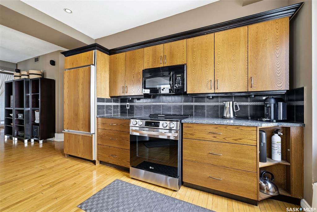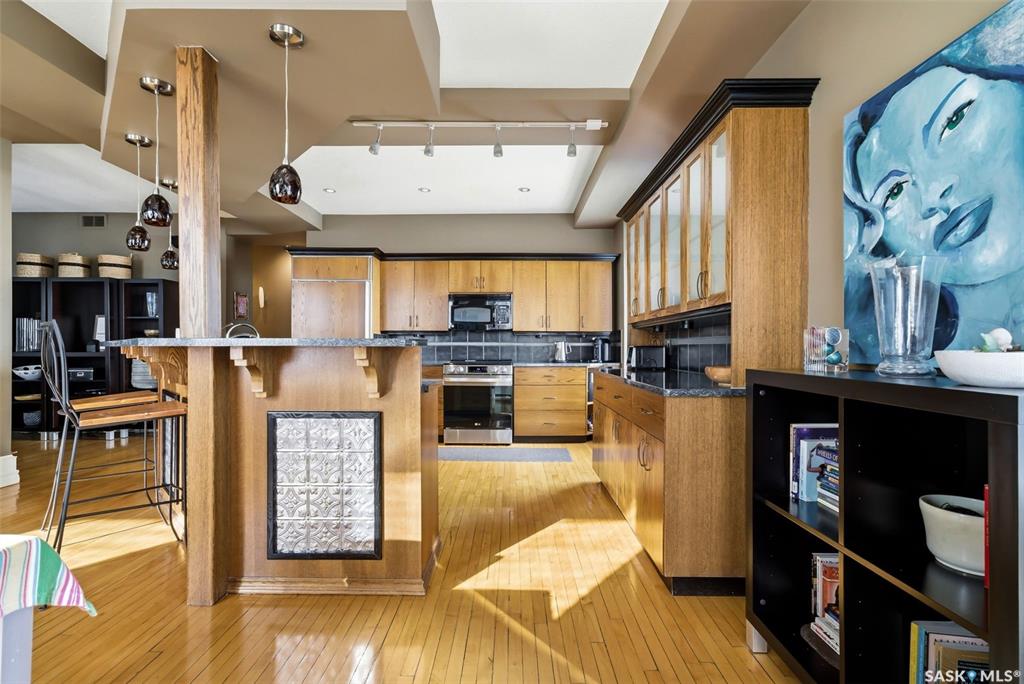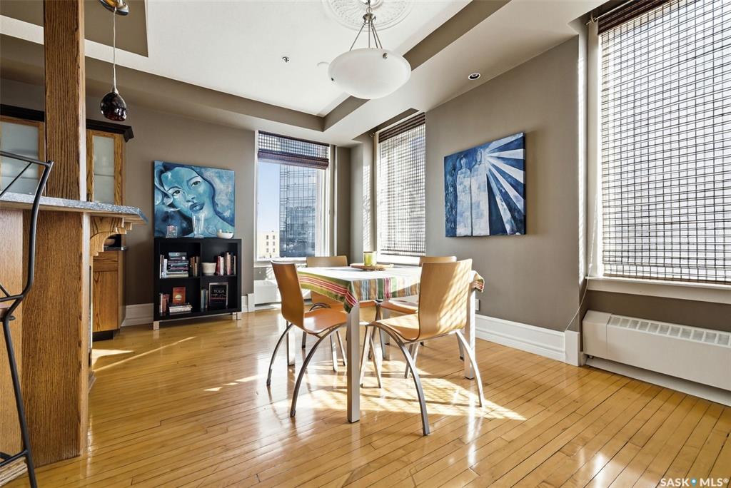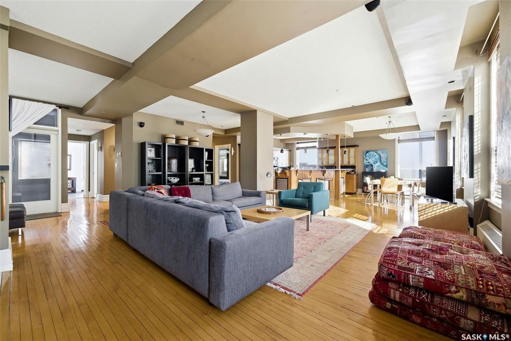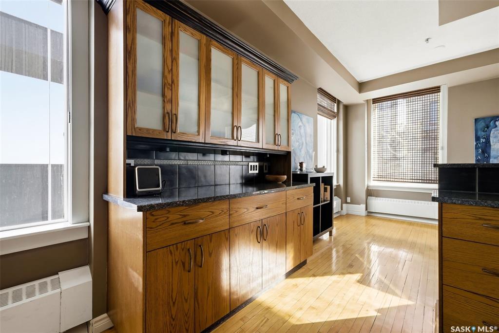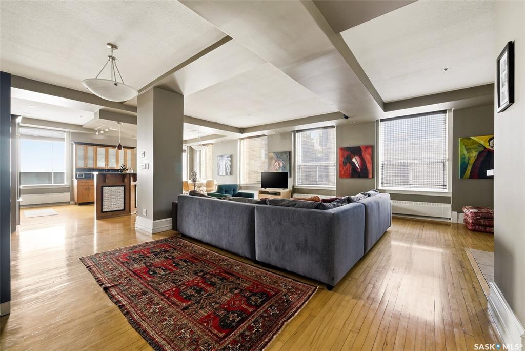 Welcome to this stunning fourth-floor residence in the historic Western Trust Building, offering over 1,900 square feet of sophisticated, south-facing luxury. This expansive open-concept layout showcases an impressive living, dining, and kitchen area — ideal for both everyday comfort and upscale entertaining. A charming nook just off the main living space provides the perfect setting for a home office or cozy library corner. The kitchen is exceptionally well appointed, featuring granite countertops, a Sub-Z...