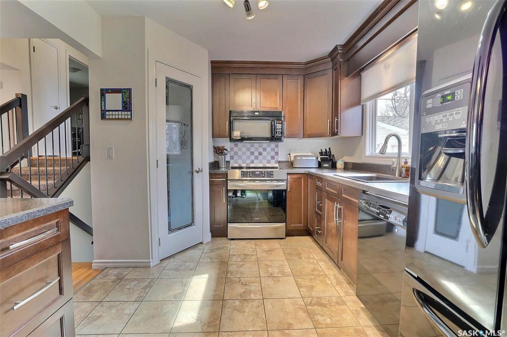 Meticulously maintained and updated 4 level split in family friendly Whitmore Park. This fantastic 4 bdrm 2 bath home exceeds expectations. Fully renovated with numerous upgrades. Spacious front entry showcases the open layout leading to the large sunlit living room with original stone fireplace feature wall. Beautifully renovated custom kitchen has an abundance of soft close maple cabinetry, including buffet wall with extra drawers, pantry, custom stove backsplash, tiled floors and an abundance of counters...