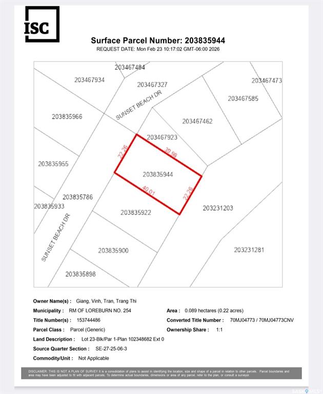 Welcome to Sunset Beach at Lake Diefenbaker, located within the Rural Municipality of Loreburn, SK. This is your opportunity to build your dream cabin on a titled, southeast-facing lakefront lot in one of the area’s most desirable resort communities. This exceptional property offers unobstructed views of the lake’s sparkling, clean water and is just steps from a beautiful natural sandy beachabd is next to green space for added privacy. Imagine enjoying peaceful mornings with breathtaking sunrises and spendi...