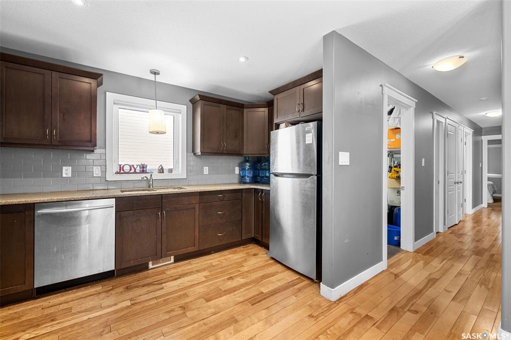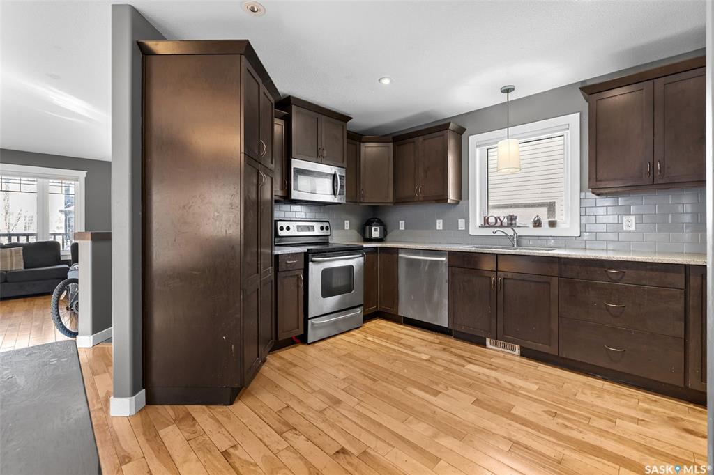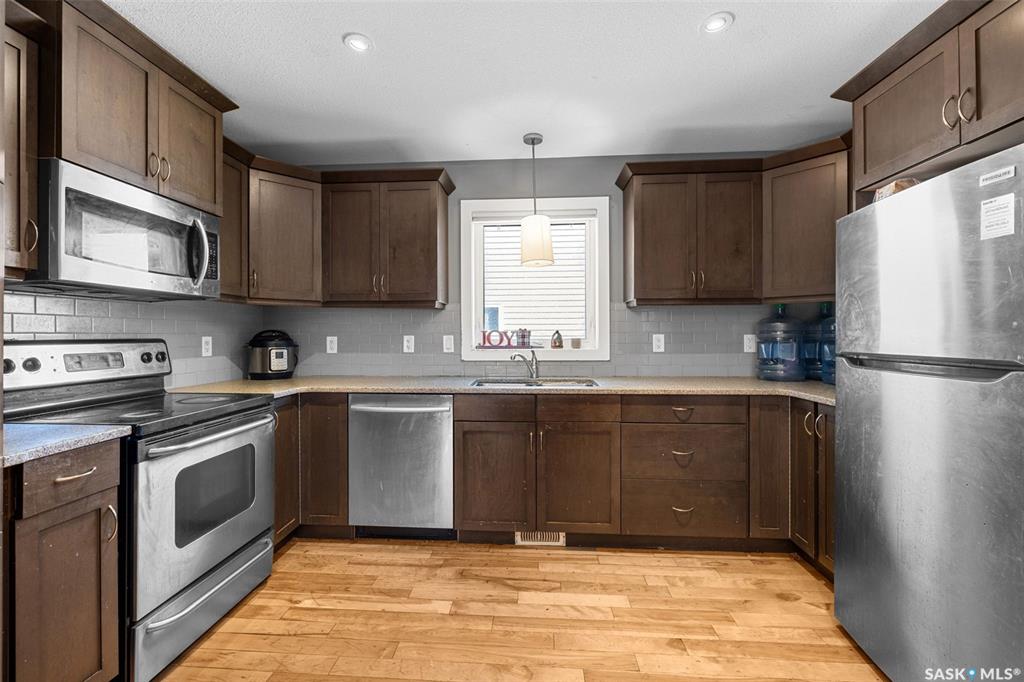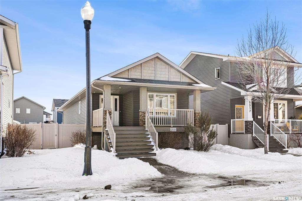 Front porch mornings. Fireplace evenings. Income potential below. Welcome to 5313 Mitchinson Way — a former Trademark Homes show home located in Regina's desirable Harbour Landing. This large 1,227 sq ft raised bungalow immediately impresses with the expansive front porch stretching across the home — the perfect place to enjoy your morning coffee or unwind in the evening. Inside, the open-concept main floor showcases hardwood and tile flooring, quartz countertops, a spacious kitchen with ample cabinetry and...