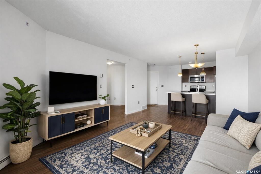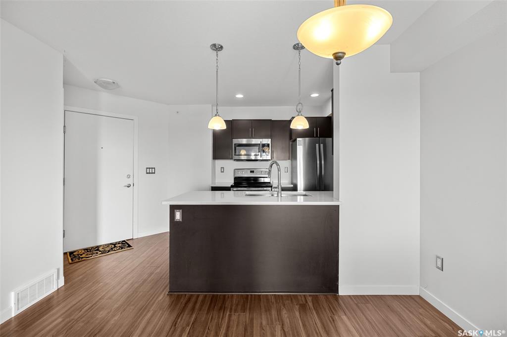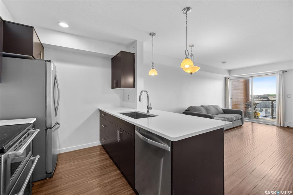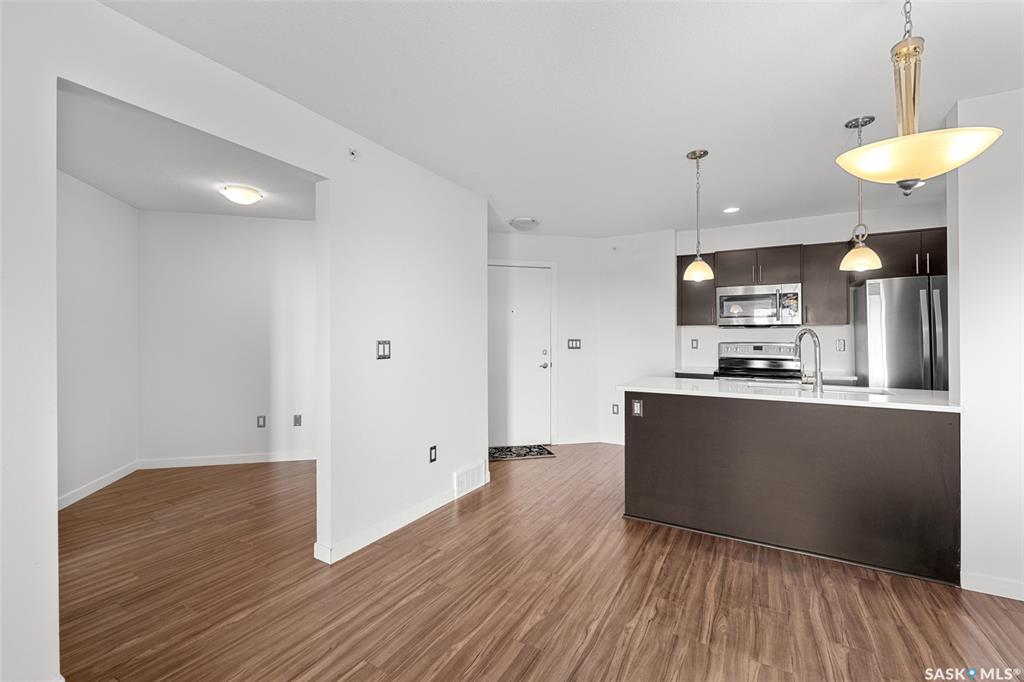 Welcome to #1414 – 5500 Mitchinson Way, located on the fourth floor of this well-maintained Harbour Landing complex. The moment you step inside, you’ll notice this isn’t your typical condo. It offers added privacy and a unique layout that truly stands out. The open-concept living space is warm and inviting, featuring laminate and tile flooring throughout, stone countertops, stainless steel appliances, and a functional eat-up island that flows seamlessly into the dining area and bright living room. Just of...
