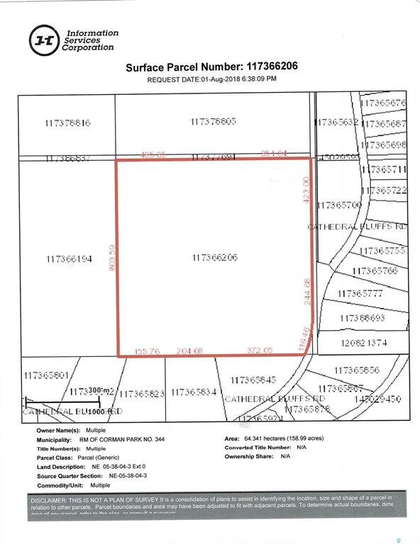 Excellent investment opportunity. A short scenic drive along the river past national historic Wanuskewan Park. Full 160 acres bordering high end country residential development of Cathedral Bluffs. Present zoning allows for 4 country residential permits of up to 5 acres with balance being agriculture residential also with building permit. Future development possible with RM of Corman Park and Hamlet of Cathedral Bluffs approval. Paved access from City of Saskatoon.